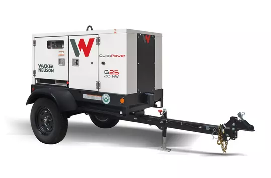 The G25 mobile generator offers contractors and rental houses an excellent power solution. The compact design includes an integrated trailer with folding tongue to allow more machines to fit on a flatbed trailer.