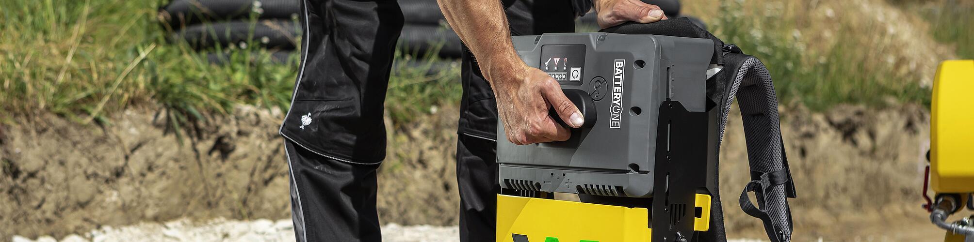 BatteryOne offers a manufacturer-independent battery system - for more flexibility, lower costs, and easy handling on the construction site. BatteryOne is currently available from Wacker Neuson, BOMAG, Mikasa, Swepac and Enarco.