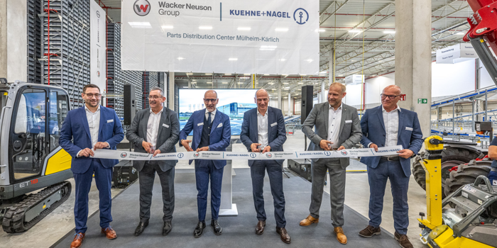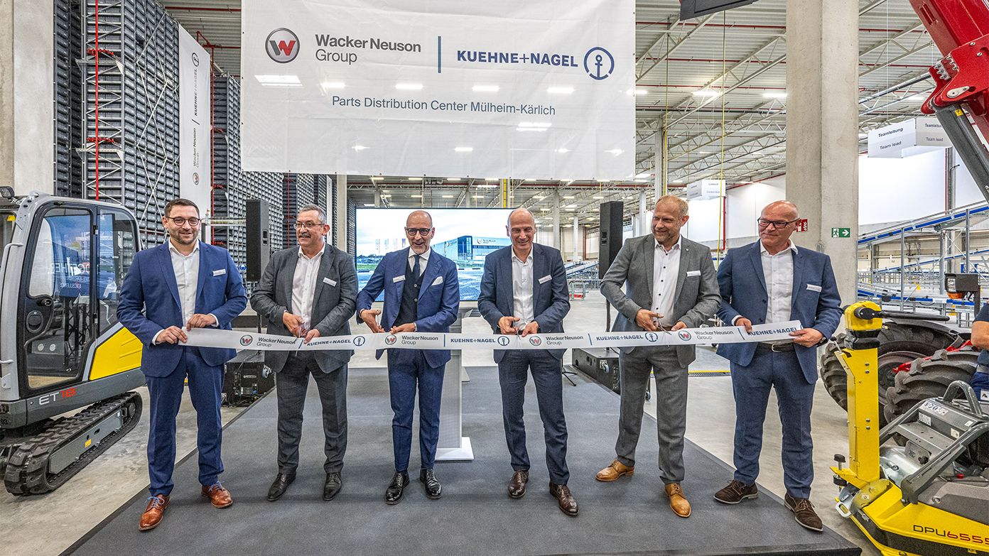 Picture of the opening, persons f.l.t.r.: Christoph Holzberger, Contract Logistics Site Manager, Kühne+Nagel (AG & Co.) KG; Axel Krichel, Mitglied der Geschäftsleitung, Kühne+Nagel (AG & Co.) KG; Gianfranco Sgro, Executive Vice President Contract Logistics Management Board, Kühne+Nagel (AG & Co.) KG; Alexander Greschner, Chief Sales Officer, Wacker Neuson Group; Andrew Voigt, Managing Director Corporate Aftermarket, Wacker Neuson Aftermarket & Services GmbH; Steffen Streubel, Head of Parts Operations, Wacker Neuson Aftermarket & Services GmbH.